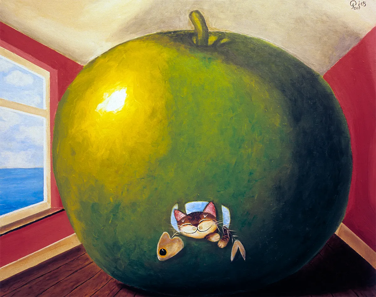 In the exhibitions, the now famous Catmasutra cat paintings display fierce loyalty to the protagonist as in “The Usual Please”, “All Play, No Work” and “One Night in Chinatown”, where the cat remains a loyal companion to the little boy through to a young man, and finally in “Tender” when he fell in love. These famous cat art paintings then move to fiercer independence, veering towards total escapism and wandering into the art of the masters. Here the Catmasutra cat “escapes” into such famous paintings by David Hockney (After the Splash 2005), Vincent Van Gogh (Sunflowers 2004, Coffeebreak at Vincent's 2005), Claude Monet (Serenading Monet 2005), Fernando Botero (Dancers 2005, Still Life with Botero 2009), René Magritte (Apple on the Inside 2005, Core of Apple 2005), Georges Seurat (Mooching by the Bay 2005), Andy Warhol (Fish Soup 2005, Hot Soup 2006, Tomato-based Catfish Soup 2007). These famous cat art paintings transport the artist and his irrepressible feline companion into the worlds of master artists, allowing us a cheeky peek on the idea of art and painting.